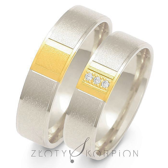 Opis: Obrączki ślubne wykonane z białego i żółtego złota. Model nawiązujący do klasyki z wstawką z żółtego kruszcu. Damska obrączka z oprawionymi centralnie kamieniami.