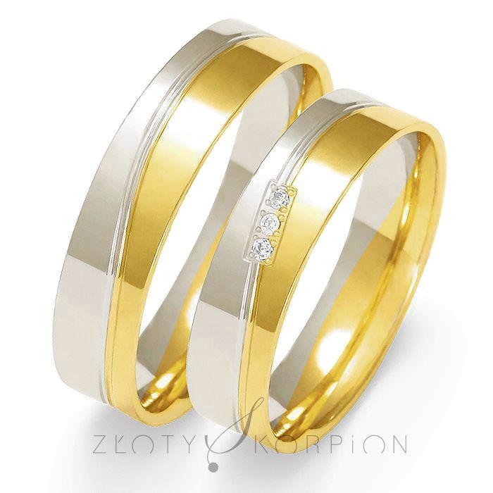 Opis: Obrączki ślubne wykonane z białego i żółtego złota. Damską obrączkę zdobią oprawione kamienie.