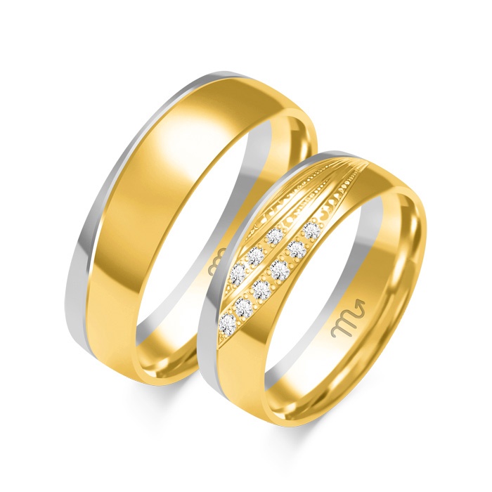 Opis: Obrączki ślubne wykonane z białego i żółtego złota. Damska obrączka bogato zdobiona kamieniami.